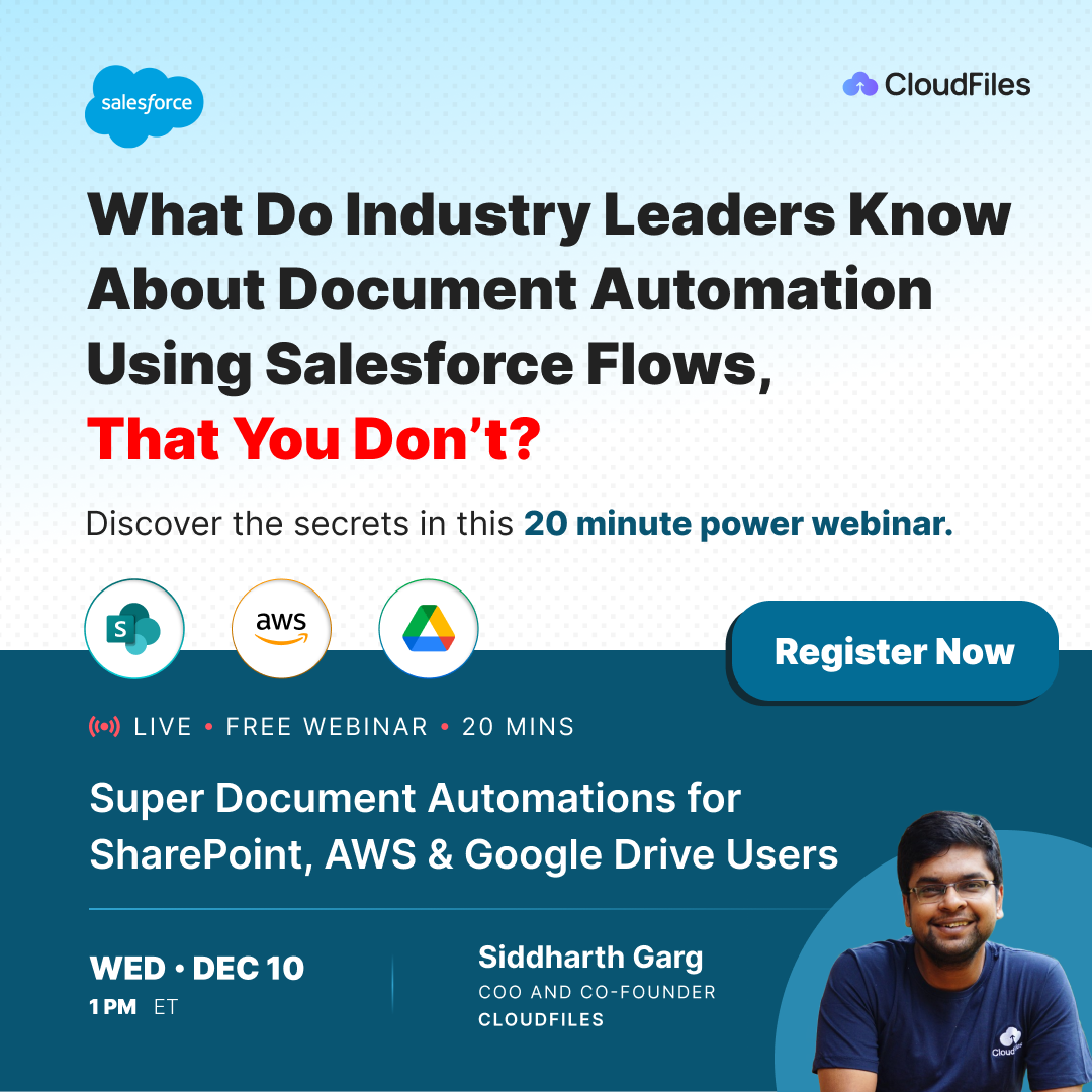 In this session, you’ll discover how CloudFiles supercharges your Salesforce experience by automating document workflows with SharePoint, AWS, and Google Drive. Whether it’s document processing, management or generation, you’ll see how to reduce manual effort and keep everything seamlessly connected inside Salesforce.